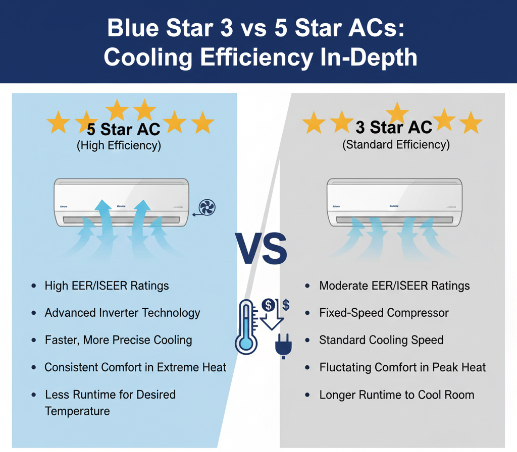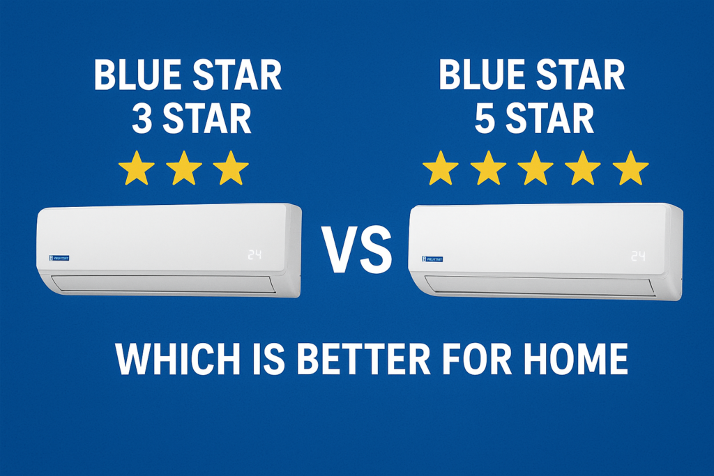 Choosing an air conditioner can be rather perplexing, especially when one is stuck between a Blue Star 3 Star vs 5 Star AC – Which is better for home? With the increase in electricity prices every year and summers getting hotter across India, picking the right energy rating is not just about cooling; rather, it’s about long-term savings, performance, and comfort. Blue Star is one of the most trusted AC brands in India, but the real difference between the company’s 3-star and 5-star models shows up in power consumption, cooling efficiency, and durability.
