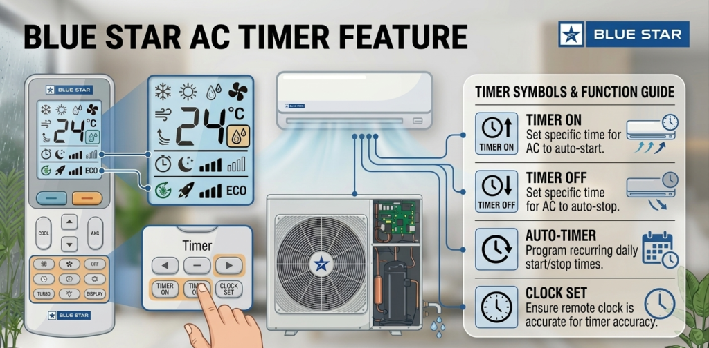 For a detailed guide on fan speeds like High, Auto, and Silent, check our complete article on Blue Star AC fan modes. Check our complete article on Blue Star AC fan modes